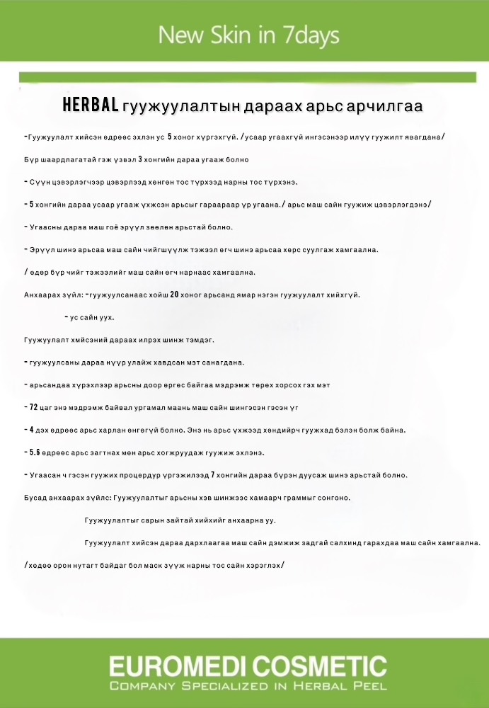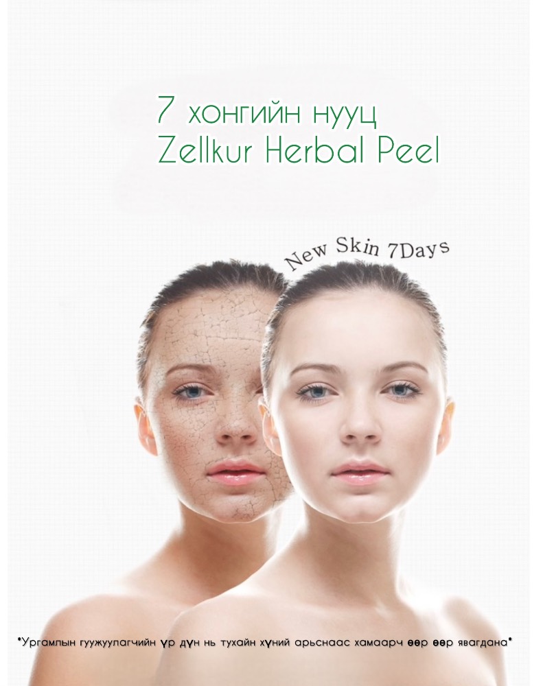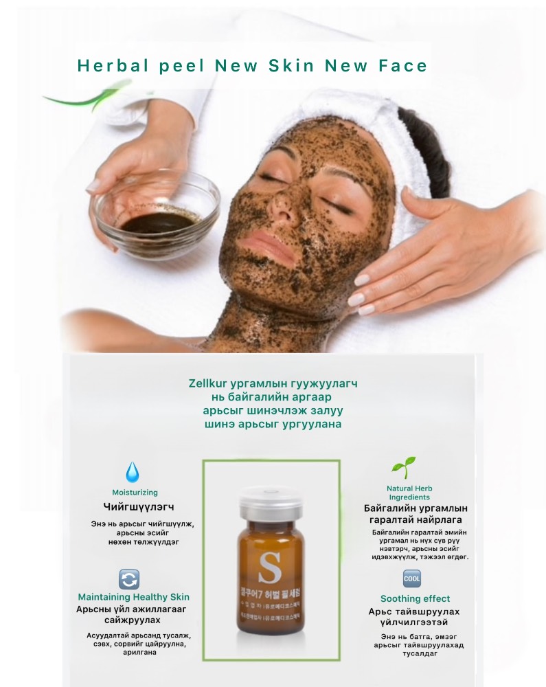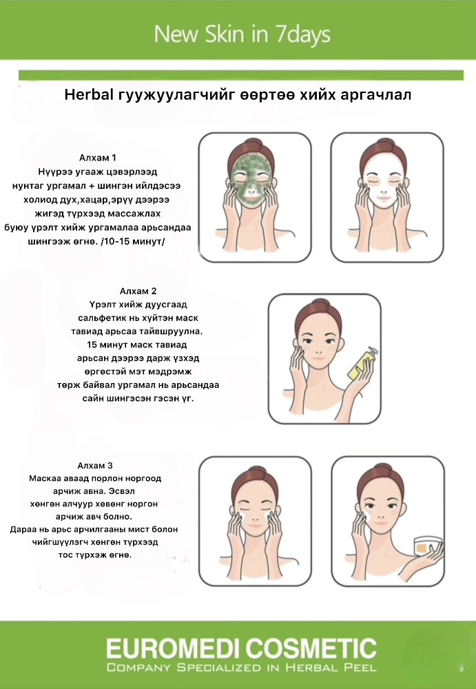 1 долоо хоногт шинэ арьс шинэ өнгө төрх өөртөө итгэх итгэлийг бий болгох, мэсгүйгээр өөрөө өөртөө арьс арчилгаа хийх шилдэг технологи юм. Олон төрлийн ургамалаас бүрдсэн нунтагыг тусгай серумтэй холин гуужуулагч ийлдэс нь арьсны гадаргуу дээрх үхжсэн эд эсийг хайлуулан шинэ эсийг бий болгоно.